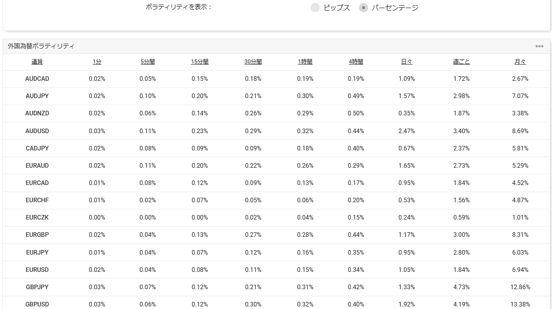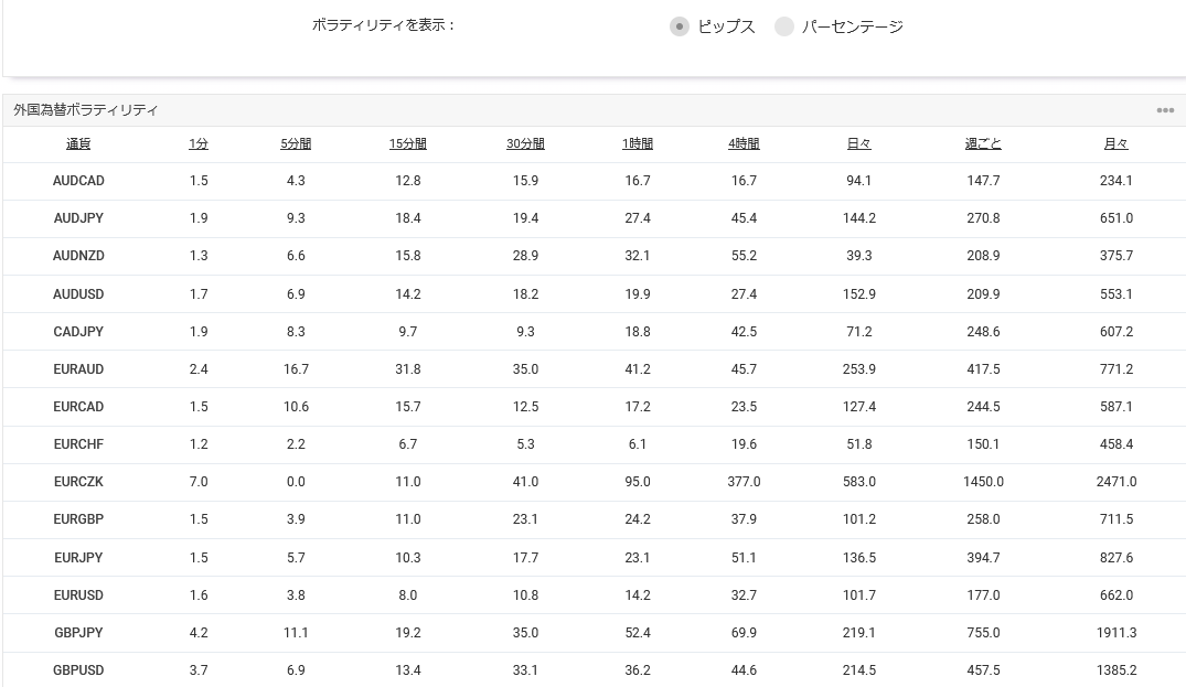 このページを開いて「ボラティリティを表示」の「ピップス」にチェックを入れると下のようになります。