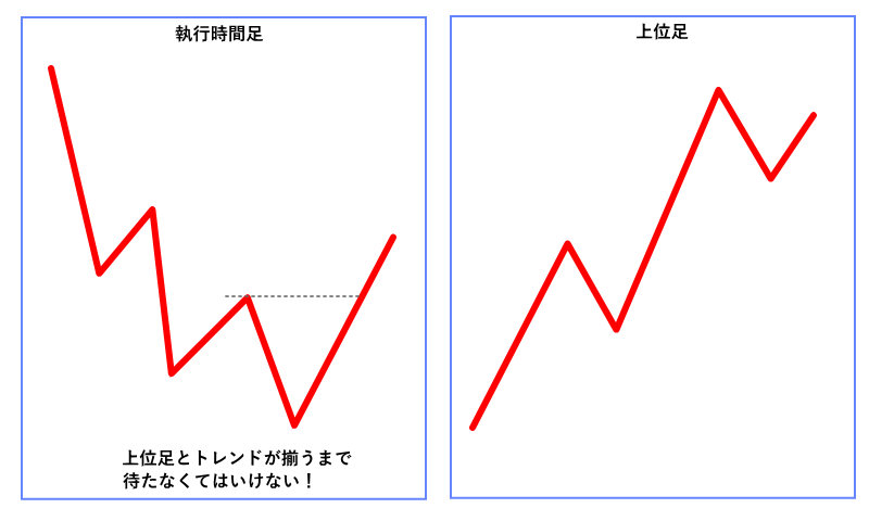 - 上位足と下位足の方向が揃うまで待たないといけない