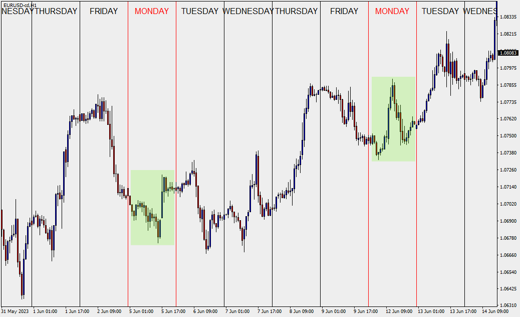 下のチャートはMT4のインジケーターを使って1時間足に曜日を表示したものです。