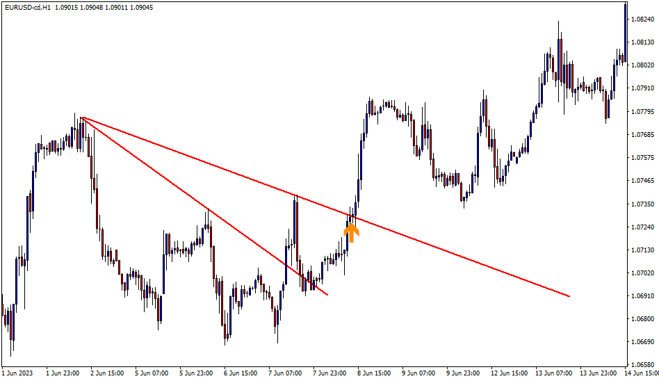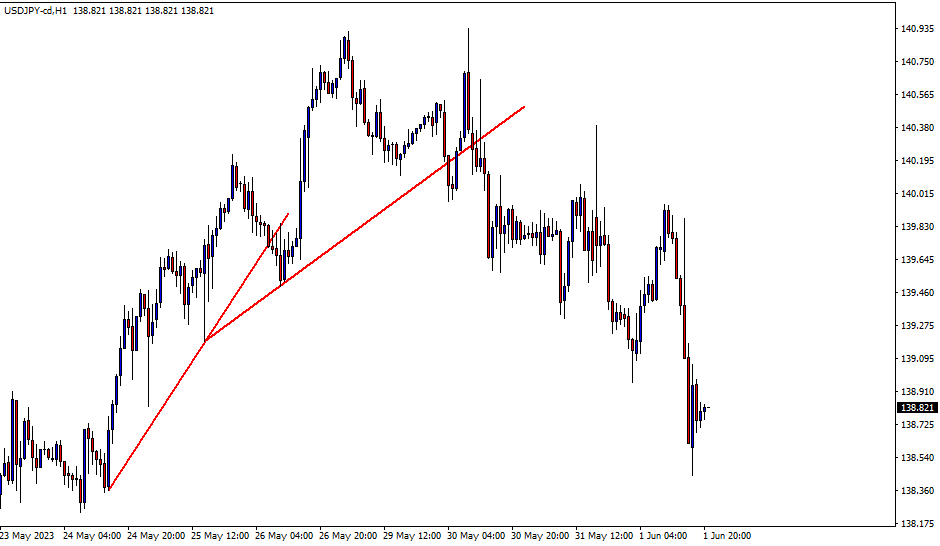 その後、2回目に引いたライン(角度の緩いライン)を割ってきたらトレンド転換と考えます。