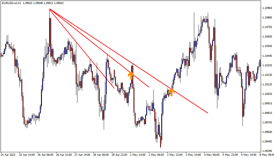 次に、最初に引いたトレンドラインの2つ目の安値と次の安値を結びます。