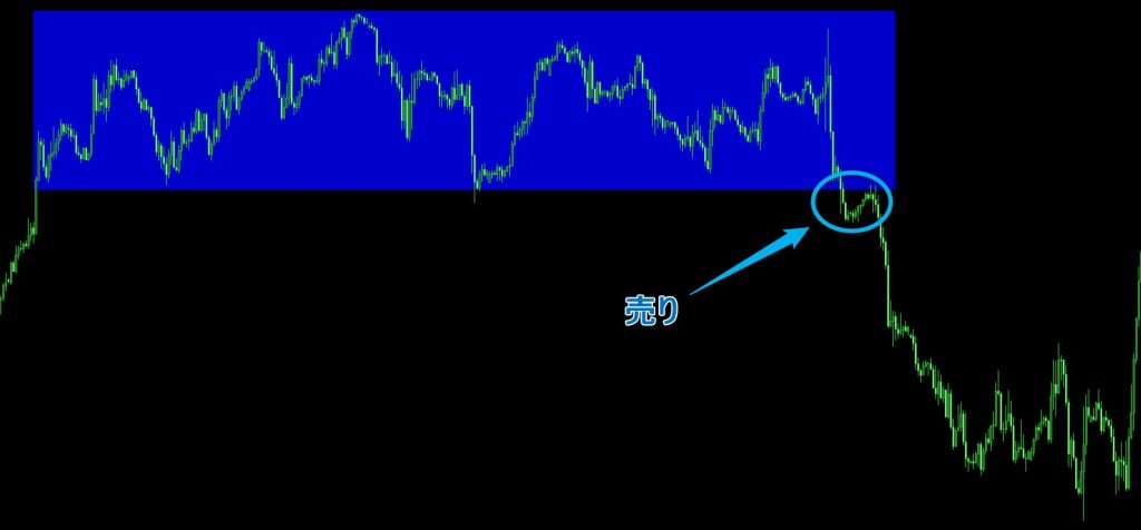 一方、ゾーンの安値(サポートライン)を下に抜けたら「売りエントリー」をしましょう。