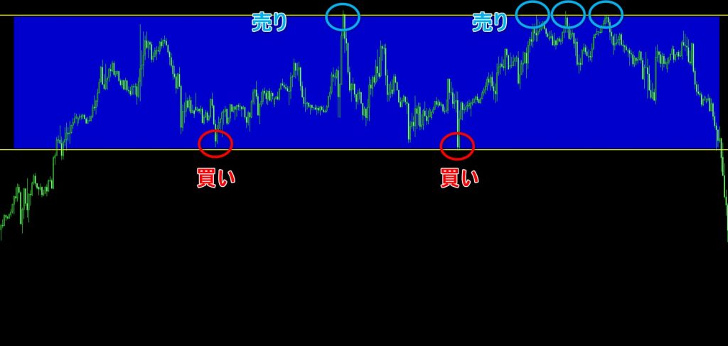 高値と安値で挟まれたゾーンに価格があるうちは、レンジ相場と判断して、上限や下限からの反転を狙います。