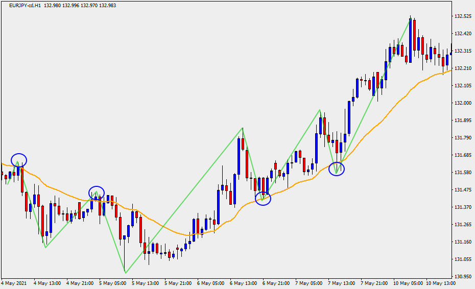 この特性は、主にトレンド相場において押し目買いをしていくときに有用な概念となります。